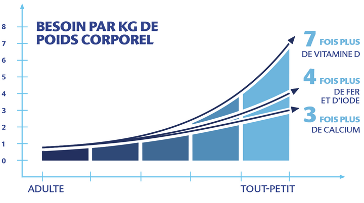 Le premier anniversaire est une étape importante du développement de votre enfant. Il commence à explorer activement le monde. Cependant, les enfants ne sont pas de petits adultes, même lorsqu’ils mangent comme les grands. Jusqu’à ce qu’ils entrent à l’école primaire, il est très important de leur fournir une alimentation adaptée à leur âge. Pour un développement sain de ses os, votre petit a besoin de 7 fois plus de vitamine D par kilo de poids corporel que vous.