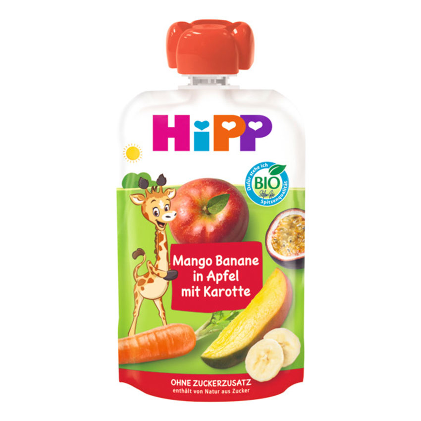 HiPP Mango Banane in Apfel mit Karotte, im praktischen Quetschbeutel.