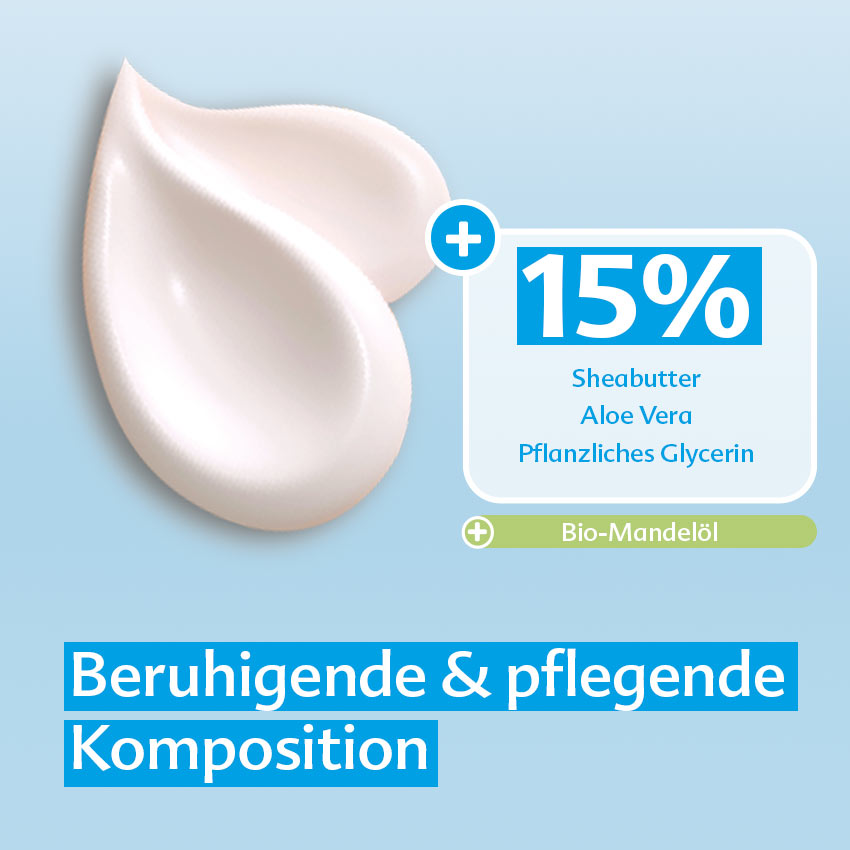 - eine beruhigende Intensivpflege für trockene Haut mit 15% Sheabutter, Aloe Vera und pflanzlichem Glycerin + zusätzlich Bio-Mandelöl