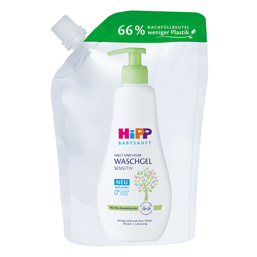 HiPP Babysanft Haut und Haar Waschgel Nachfüller, im praktischen Nachfüllbeutel – 66% weniger Plastik.